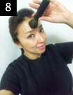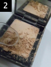 使う前には、ブラシをよく振ります。ブラシの毛の部分を下に向けて、腕全体を使ってかなり強めに振ってください。パウダーが粉々になっていないと、粒のまま出てきてしまうので、ブラシを指でパラッとなでて、使う前に確認してください。砕かれていないと感じたら4~6を繰り返してください。